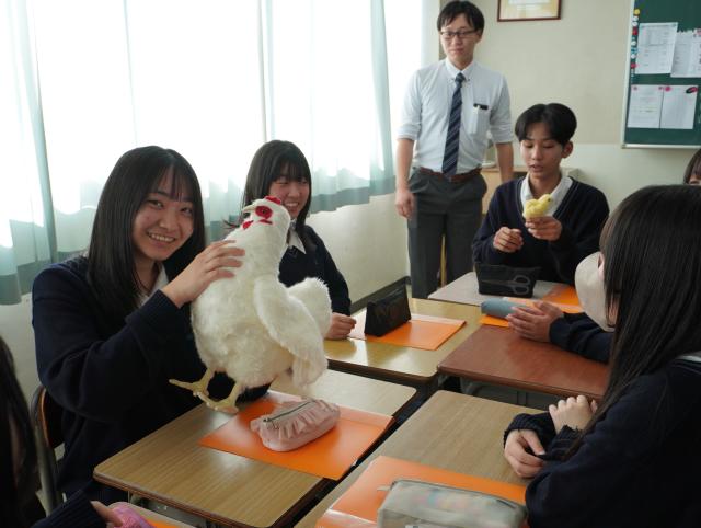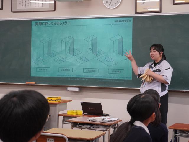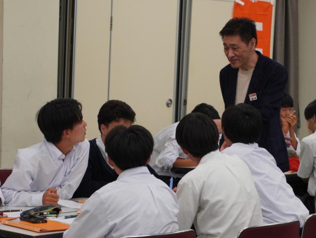 この取り組みは、人材サービス会社「マイナビ」のプログラムの一環で、地元企業への関心を高め、将来のキャリアビジョンの形成を目的とした出張講義が開かれました。対象はグローカルDX課題研究Ⅰの授業を受けている高校1年生全員で、県内企業14社の担当者が来校し、仕事内容や企業の魅力を聞きました。