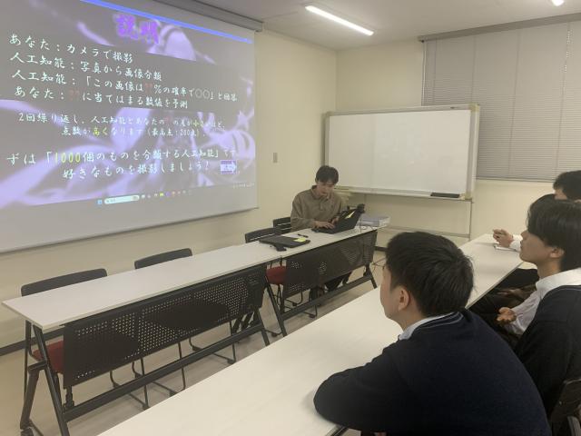 神経AIインテグレーション研究室では、AIが画像を認識して判断する体験や事前学習に頼らず自律的に機能するAIの研究を紹介していただきました。AIの判断の仕組みやAI学習の奥深さを実感しました。