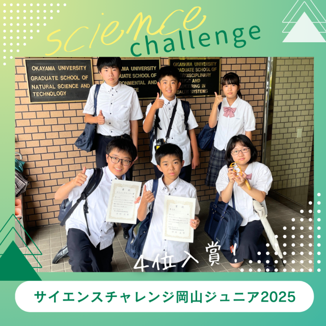 8月に岡山大学にて行われたサイエンスチャレンジ岡山ジュニア2025に、岡山学芸館清秀中学校より2チームが出場し、中学1年生チームが4位に入賞しました。