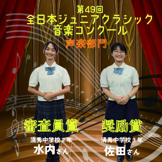 8月に開催されました全日本ジュニアクラシック声楽部門 全国大会(中学生の部)で、清秀中学校の合唱部2名が出場し賞を頂きました。