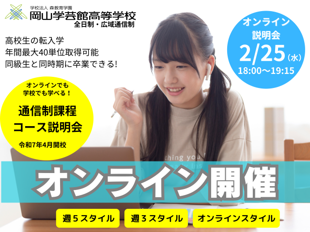 岡山学芸館高校 通信制課程のオンライン説明会を以下の2日程で追加実施いたします。