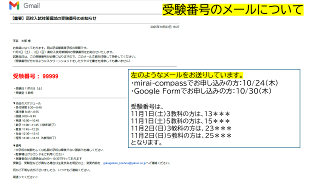 受験番号を案内しているメールは、添付のようなものをお送りしております。