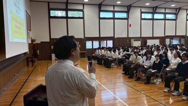 9月30日(火)岡山大学工学部・情報工学先進コース長の渡邊実教授にお越しいただき、約310名の高校1年生と希望の保護者に向けて、岡山大学の特徴や岡山大学工学部の学びについてご説明をいただきました。